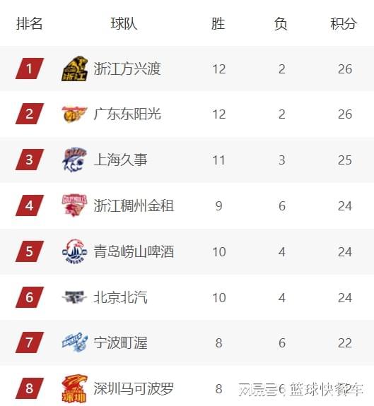 CBA积分榜最新排名出炉!广厦广东稳居前2:辽宁队已下滑至第11?