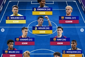 德转列西甲U21最贵阵:亚马尔2亿欧领衔巴萨5将,居勒尔&怀森在列